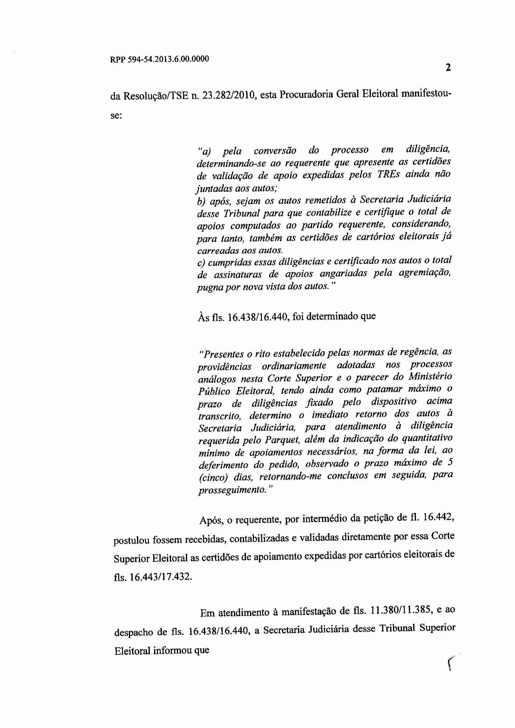 Por fim, a procuradoria desfavorece a concessão do registro, porém não prejudicando posterior deferimento, depois de cumpridas diligências: “Por todo o exposto, o Ministério Público Eleitoral manifesta-se por que seja reconhecido que o pedido de registro continua sem condições de ser atendido, sem prejuízo de que o seja em momento posterior, quando inequivocamente comprovados os apoiamentos mínimos exigidos por lei.”, finaliza.