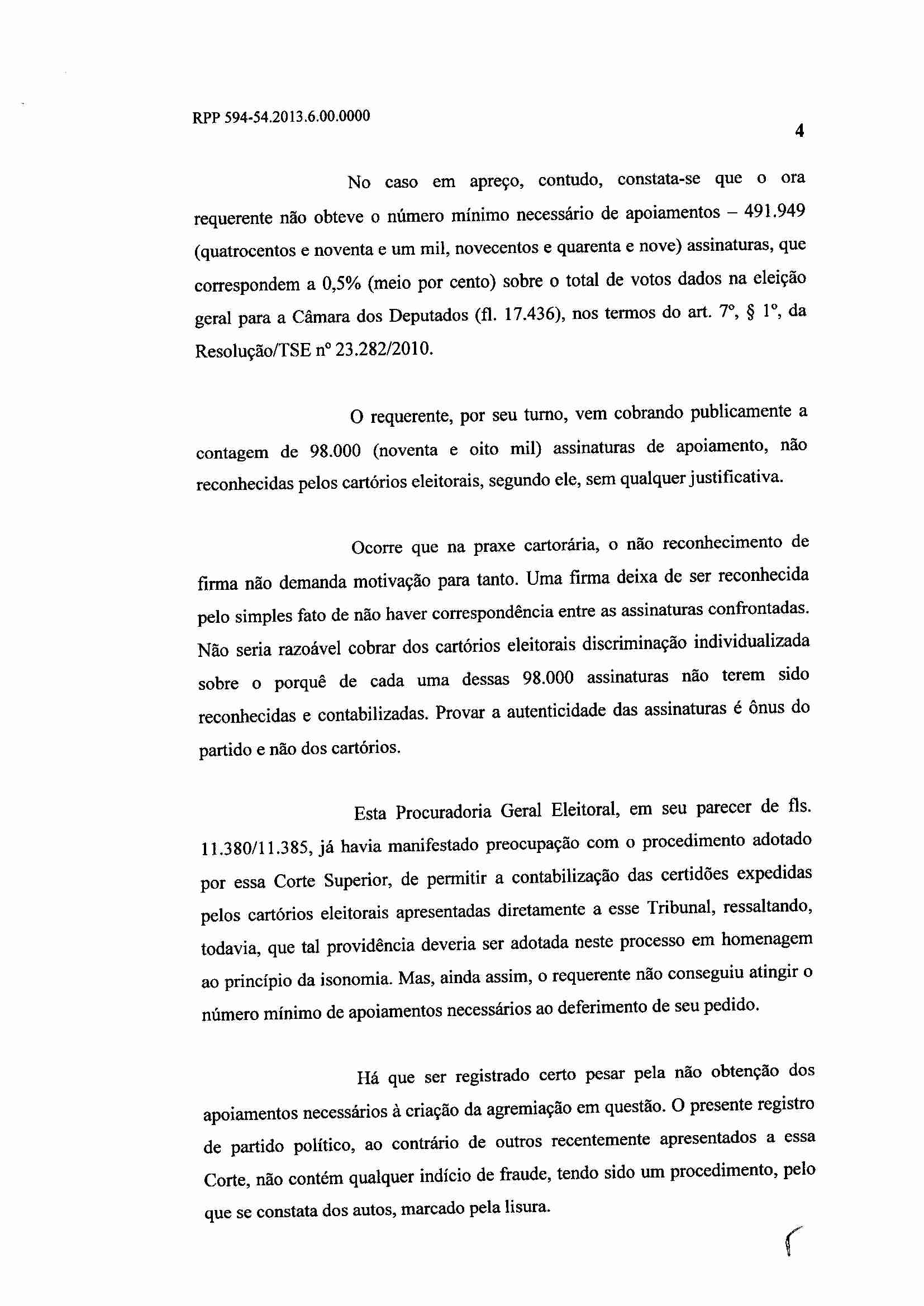 O vice-procurador demonstrou certo “pesar” sobre a decisão alegando que foram cumpridas todas as diligências na mais perfeita lisura, sem aparentemente ocorrer fraudes: “O presente registro de partido político, ao contrário de outros recentemente [referindo-se ao PROS, Solidariedade e possivelmente até o PSD] apresentados a esta Corte, não contém qualquer indício de fraude, tendo sido um procedimento, pelo que se constata dos autos, marcado pela lisura.”.