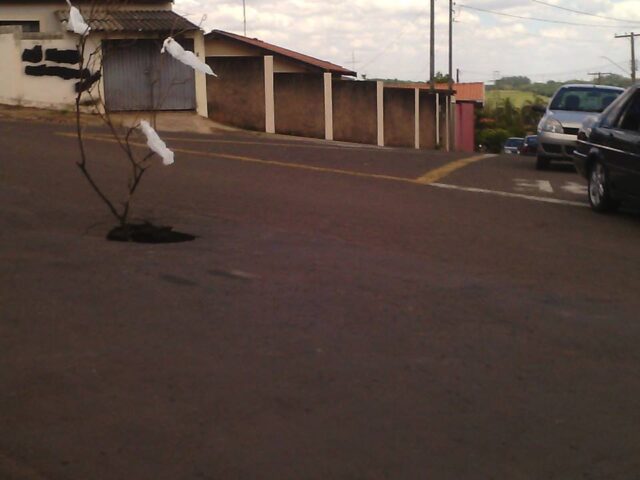 Se não bastasse esses dois problemas, um novo surgiu ontem um pouco mais acima desse. Um buraco com água dentro começou a ser aberto engolindo o asfalto. Revoltados, os moradores do bairro sinalizaram o buraco com um galho de árvore.