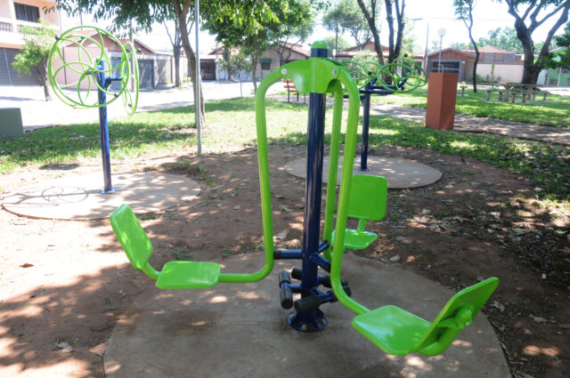 indicado para fortalecer os grupos musculares dos membros inferiores, superior e melhoria da capacidade cardiorespiratória; um remador com capacidade para uma pessoa, indicado para exercitar os membros superiores e inferiores; um simulador de caminhada com capacidade para três pessoas, indicado para aumentar a mobilidade dos membros inferiores e desenvolver coordenação motora; um esqui com capacidade para três pessoas, indicado para membros inferiores, quadris, membros superiores e função cardiovascular; um alongador com capacidade para três pessoas, indicado para alongar e fortalecer os grandes grupos musculares, estimulando o sistema nervoso central; um surf ou twisth lateral com capacidade para duas pessoas, indicado para condicionamento e fortalecimento da flexibilidade dos membros inferiores do corpo, quadris e região lombar; um leg press com capacidade para três pessoas, indicado para fortalecimento da musculatura das pernas e quadris; uma rotação dupla diagonal, com capacidade para três pessoas, indicado para fortalecer os membros superiores e melhorar a flexibilidade dos ombros; e uma rotação vertical, com capacidade para três pessoas, indicado para fortalecer os membros superiores e melhorar a flexibilidade dos ombros.
