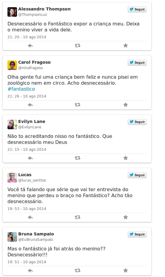 “Desnecessário o Fantástico expor a criança”, escreveu um internauta, enquanto o outro bravou: “Você tá falando que sério que vai ter entrevista do menino que perdeu o braço no Fantástico? Acho tão desnecessário“.