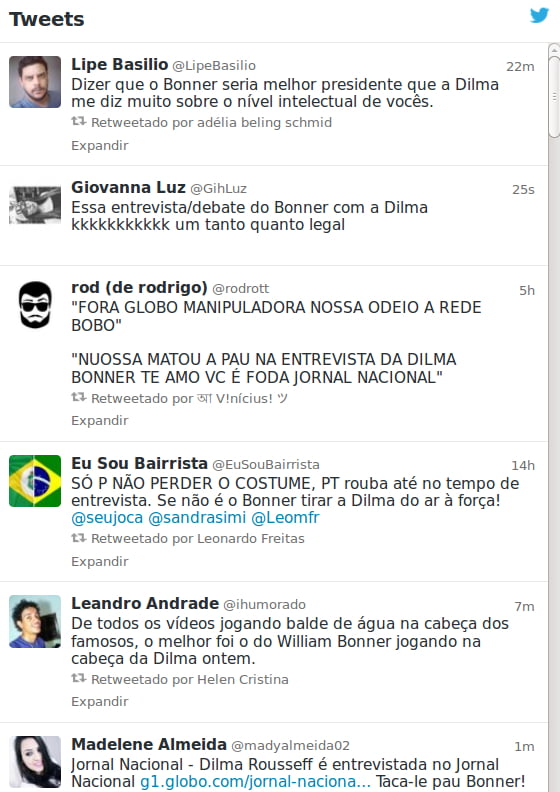 Parte dos usuários do microblog exaltou a postura de Bonner e entendeu que o jornalista saiu “vitorioso” da entrevista. “Willian Bonner demonstrou que é um brilhante jornalista. Parabéns!”, elogiou @leveadvogado. “O Bonner pergunta sobre o Brasil. Dilma responde sobre um país imaginário no qual até os suíços adorariam morar”, comentou @gravz . “Dilma é o Brasil e o Bonner, a Alemanha”, postou @LordeVoIdemort . “Bonner para presidente”, pediu @StayAlive_H_.Outro grupo de tuiteiros afirmou a presidente foi muito bem na entrevista. Muitos criticaram Bonner pelo tom das perguntas e disseram que ele falhou como jornalista. “Uma coisa ninguém pode negar: a Dilma foi a única dos candidatos que não se intimidou com o William Bonner e a Patrícia Poeta”, ressaltou @jooseanee. “Previsão: Bonner e Poeta serão novamente acusados de petistas. O motivo? Dilma foi bem na entrevista”, avaliou @lucasrohan. “A entrevista do Bonner, ontem, no JN, foi um manual de como um jornalista não deve se comportar. Parecia um interrogatório violento”, opinou @AdrianoArgolo .Veja o que estão dizendo sobre a entrevista no Twitter:
