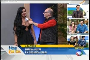 Britto Jr. entrevista Lorena Bueri, durante apresentação da sétima edição de “A Fazenda”. Lorena Bueri foi assistente de palco de João Kleber e “Gata do Paulistão”, em 2012