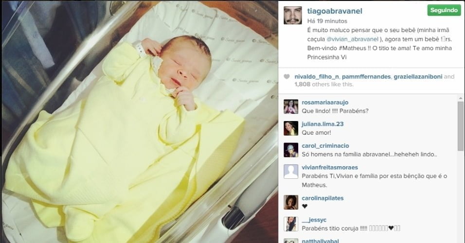 “É muito maluco pensar que o seu bebê (minha irmã caçula @vivian_abravanel ), agora tem um bebê !rs. Bem-vindo #Matheus !! O titio te ama! Te amo minha Princesinha Vi”, escreveu Tiago.