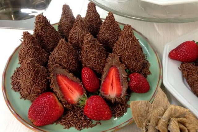 Faça bolinhas de brigadeiro, coloque o morango e vá moldando até obter o formato de coxinha, depois é só colocar as “coxinhas” para gelar por alguns minutos para que a consistência fique perfeita!