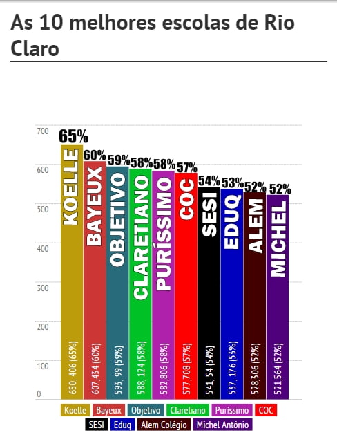 Segundo o cálculo feito pelo PiraNOT, com base nos dados divulgados pelo INEP, a escola com média geral mais alta de Rio Claro é o colégio privado Koelle, que obteve nota média 650, 406 (cerca de 65% do exame). A pior nota foi da escola estadual Nelson Stroili, com 454, 178 pontos, cerca de 45% do exame.
