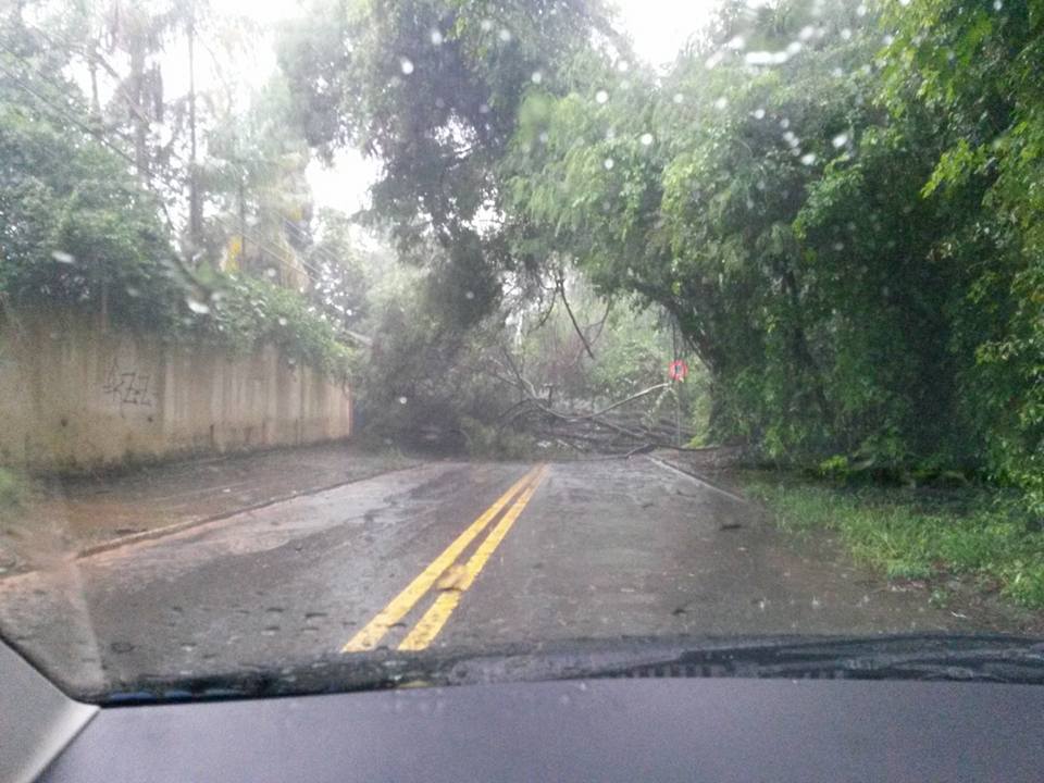 O leitor Diego Nalin enviou uma imagem de uma queda de árvore na Estrada do Meio, próximo ao bairro Nossa Senhora Aparecida, região da Vila Fátima. O trânsito no local está impedido.
