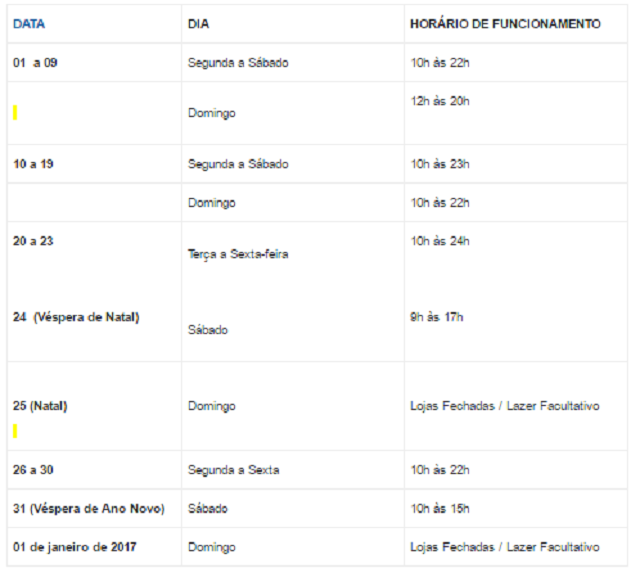 Na véspera do Natal, dia 24, o atendimento será das 9h às 17h, e no dia 31 das 10h às 15h. Nos dias 25 de dezembro e 1º de janeiro de 2017, as lojas ficarão fechadas e as operações de alimentação e lazer terão funcionamento facultativo.
