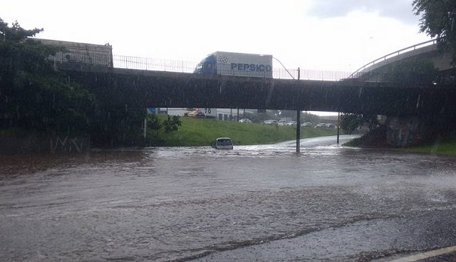 Imagens recebidas de um leitor mostram como ficou em baixo do viaduto da Avenida Limeira após cerca de 30 minutos de chuva e vento. O trânsito no local estava complicado até às 14h10.
