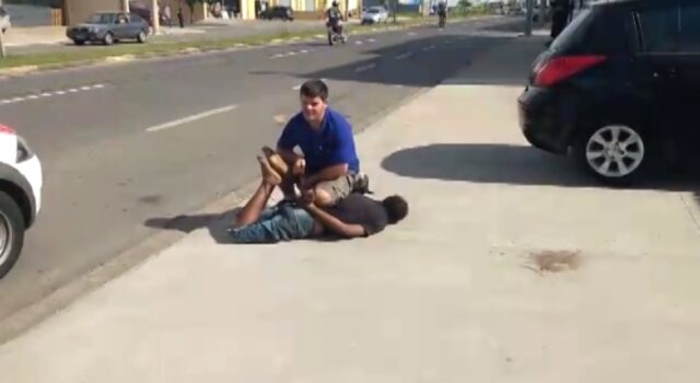 Segundo a vítima, ela ouviu o alarme do seu carro disparar e saiu para fora do barracão, na Avenida Cristóvão Colombo, onde trabalha. Nesse momento avistou o bandido tentando fugir do local com o veículo e reagiu prendendo ele até a chegada da Polícia Militar.