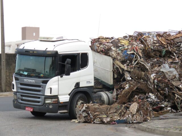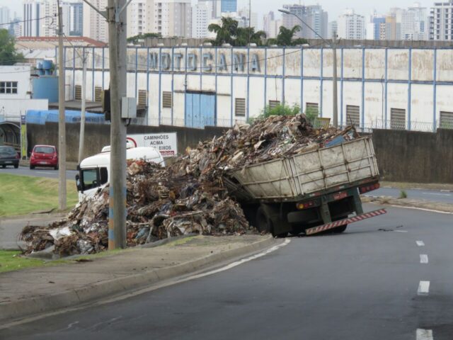 Parte da carga não suportou o movimento e caiu. Não há lentidão no trânsito no local e nem previsão de remoção do veículo e da sucata até a publicação desta nota.