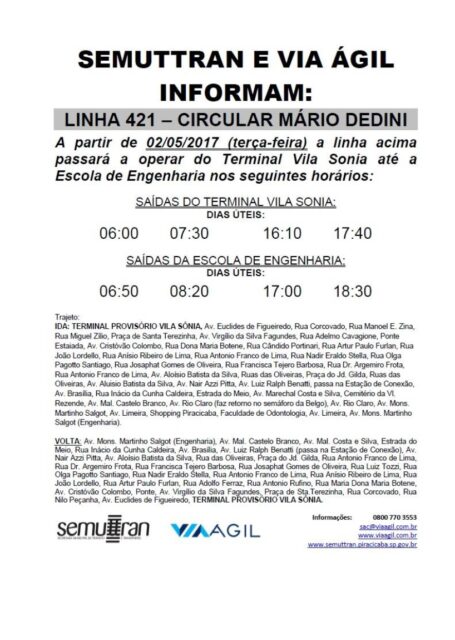 A segunda a ser alterada é a “421 – Ciruclar: Mário Dedini”. Esta linha em alguns horários passará a atender a Fumep e Cotip na Vila Areão. Confira na foto as alterações: