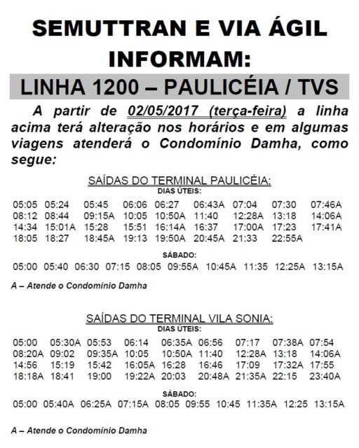 A linha que será extinta é a “421 – Bongue – TVS (Terminal da Vila Sônia)”. No lugar ficará a “1.200 – Pauliceia/Vila Sônia” que atenderá ao condomínio Damha de segunda à sábado.