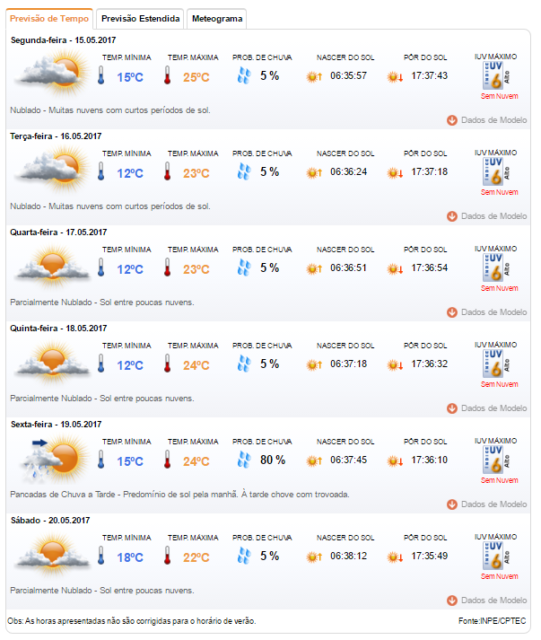 De acordo com o Centro, a semana começa com mínima de 15° e máxima de 25°. Ao longo dela deverá ocorrer uma queda de 02°, mas até sexta-feira (19), a temperatura volta a subir. Neste mesmo dia há 80% de chance de chover.