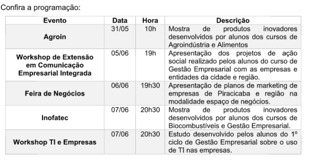 De brigadeiro vegano à pintura de escola pública e aplicativo para transporte público. Estes são alguns dos projetos que serão apresentados na Fatec Piracicaba Deputado Roque Trevisan. Os eventos são gratuitos e abertos à comunidade e terão início no dia 31 de maio com a IX Agroin seguidos pelo III Workshop de Extensão em Comunicação Empresarial Integrada no dia 5 de junho, da 12ª Feira de Negócios no dia 6 de junho e o encerramento será realizado no dia 7 de junho com a XII Inofatec e II Workshop TI & Empresas.