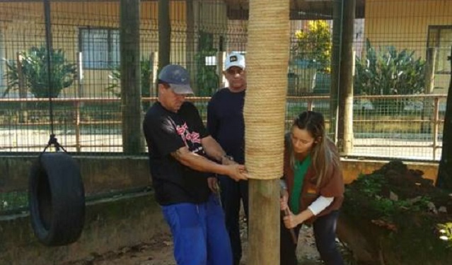 Para estas atividades, algumas peças são criadas, construídas e instaladas nos recintos pela estagiária Franciele para despertar a curiosidade e desafiar alguns animais. Por exemplo, nesta segunda-feira (29) as onças pintadas, foram recolhidas, e, quando voltaram ao recinto encontraram um dos pilares do recinto revestido de corda. Rapidamente ela “escalou” em busca do prêmio que estava no alto, uma bola presa por um fio. Outra bola, de capotão, “deixada” no recinto também contribui para estimular “estes gatinhos” gigantes.