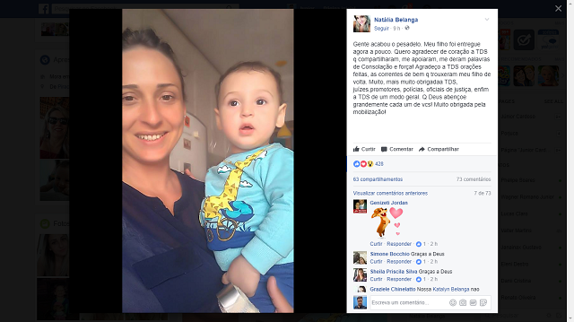 Pelas redes sociais Natália Belonga agradeceu a ajuda que recebeu de amigos, da polícia e da justiça. “Acabou o pesadelo. Meu filho foi entregue agora há pouco. Quero agradecer de coração todos que compartilharam, me apoiaram, me deram palavras de consolação e força”, disse a cabeleireira que tem 33 anos.