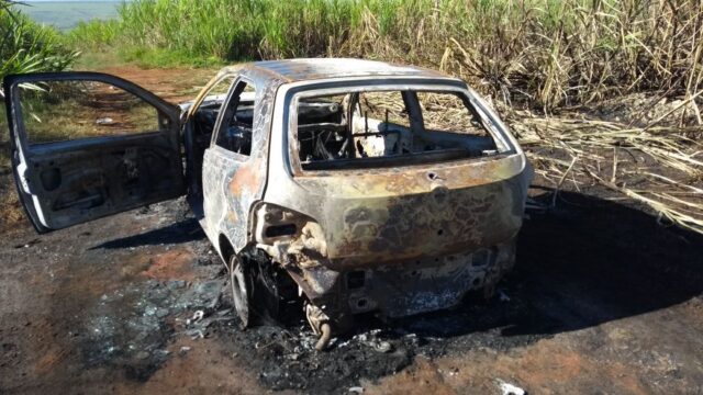 Segundo a guarnição, uma denúncia às 09h20 levou os agentes Valverde e Vanessa até um canavial que fica na Estrada Municipal do bairro Santa Isabel onde localizaram o carro. Ele estava totalmente queimado. Isso impossibilitou a identificação.