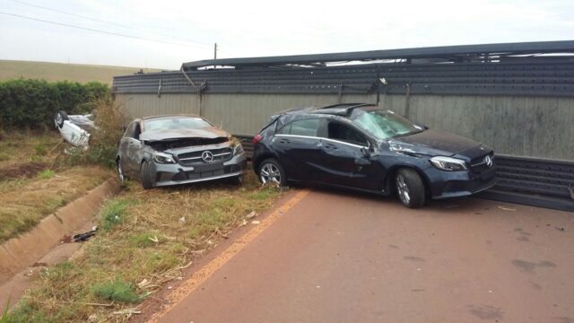 O acidente ocorreu quando os caminhões cegonha colidiram lateralmente. A carga tombou e os carros modelo Classe C, avaliados em mais de R$ 140 mil cada, ficaram espalhados pela pista. As causas serão apuradas.