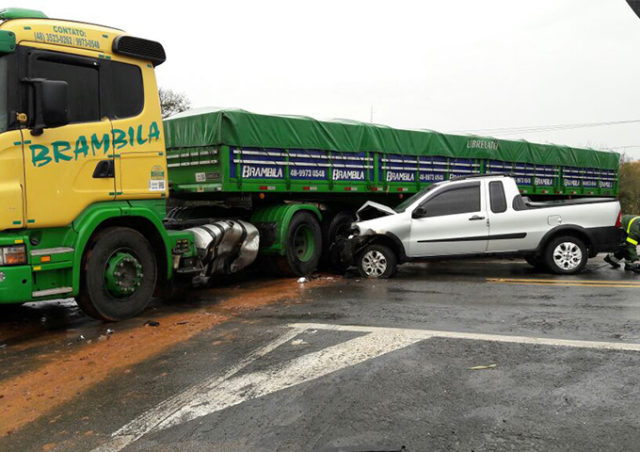 Com a colisão, o Fiat atingiu o tanque de combustível do caminhão, que fica do lado do motorista. O tanque acabou se rompendo e derramando diesel pela pista.