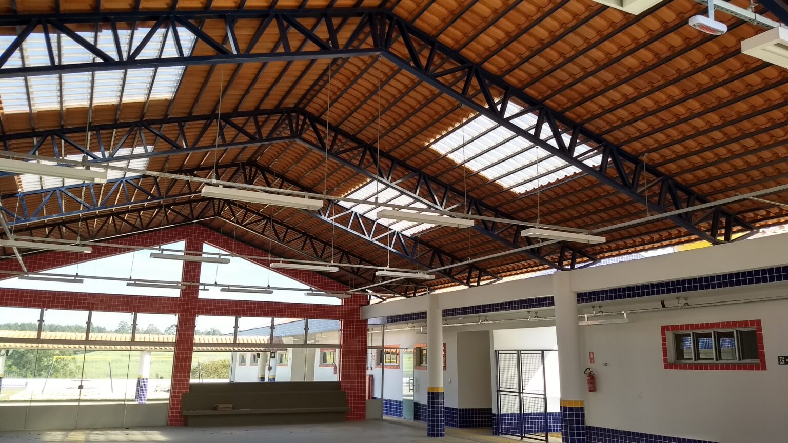 A escola contará também com cozinha, dispensa, rouparia, sanitários, secretaria, diretoria, sala de professores, almoxarifado, pátio interno coberto e gramado amplo.