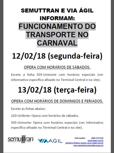 A Via Ágil (empresa responsável pelos ônibus do município de Piracicaba) informa que, no Carnaval, algumas linhas terão os seus horários alterados.