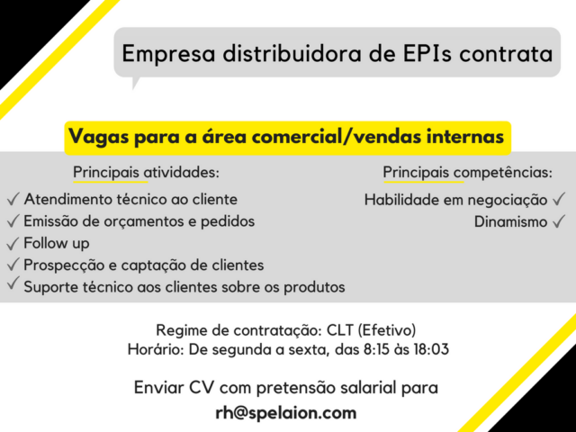A empresa Spelaion está abrindo vagas de emprego para área comercial e vendas internas, em Piracicaba. As vagas são CLT (efetivo) com horário de segunda a sexta-feira, das 8h15 às 18h03.