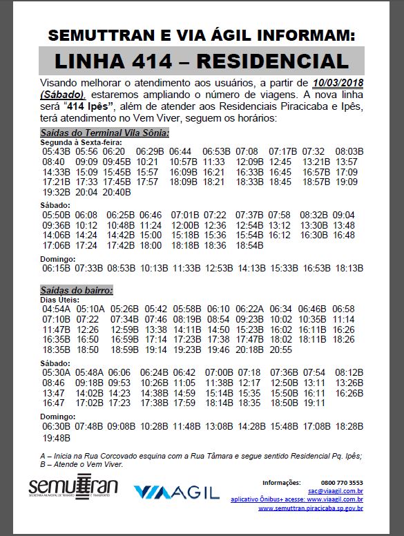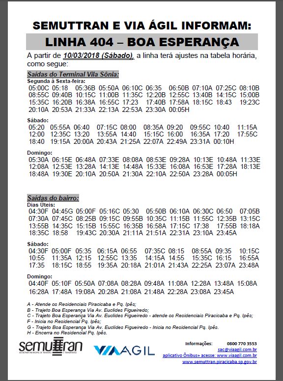 A Via Ágil, empresa responsável pelos ônibus de Piracicaba, em parceria com a Semuttran (Secretaria Municipal de Trânsito e Transporte) está promovendo mais alterações em linhas de ônibus do município. Agora, as alterações são na Linha 404 – Boa Esperança. Segue abaixo a nova tabela de horários.
