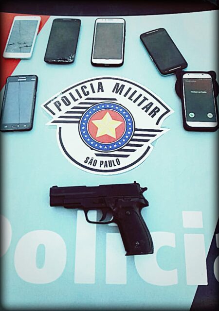 No bagageiro da motocicleta, policiais apreenderam seis aparelhos celulares. Já na cintura do indivíduo, policiais flagraram uma réplica de pistola calibre 380.