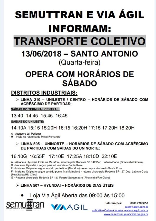 No feriado desta quarta (dia em que Piracicaba comemora o dia de Santo Antônio), os ônibus operam com horário de sábado. Confira abaixo todos os detalhes.