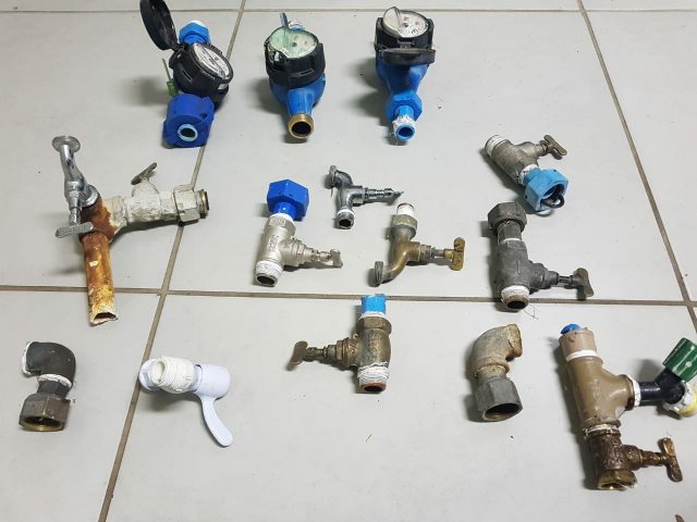 Com ele, policiais encontraram a res-furtiva dentro de uma sacola — sendo três relógios de medição de consumo de água, cinco torneiras, seis registros e dois cotovelos hidráulicos. Ele confessou o crime.