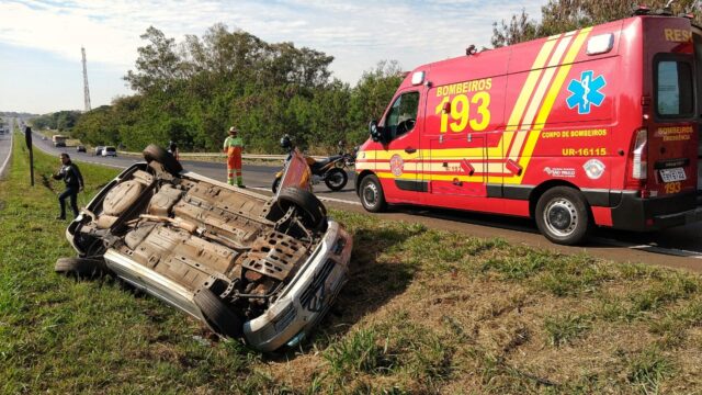 Após o acidente, o carro ficou capotado no canteiro central. A vítima sofreu um trauma no tórax e acabou encaminhada ao Hospital da Unimed pela Unidade de Resgate.