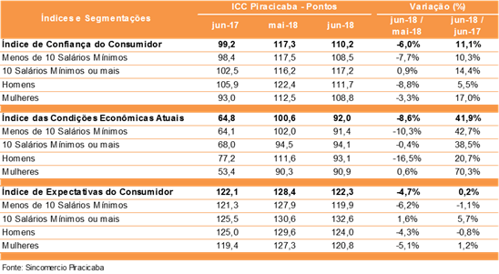 O Índice de Confiança do Consumidor (ICC) Piracicabano registrou queda no mês de junho, se comparado ao mês anterior (6%). Apurado pelo Sindicato do Comércio Varejista de Piracicaba (Sincomércio Piracicaba), o índice registrou 110,2 pontos — sendo zero o equivalente a pessimismo total, e 200 o equivalente a otimismo total.