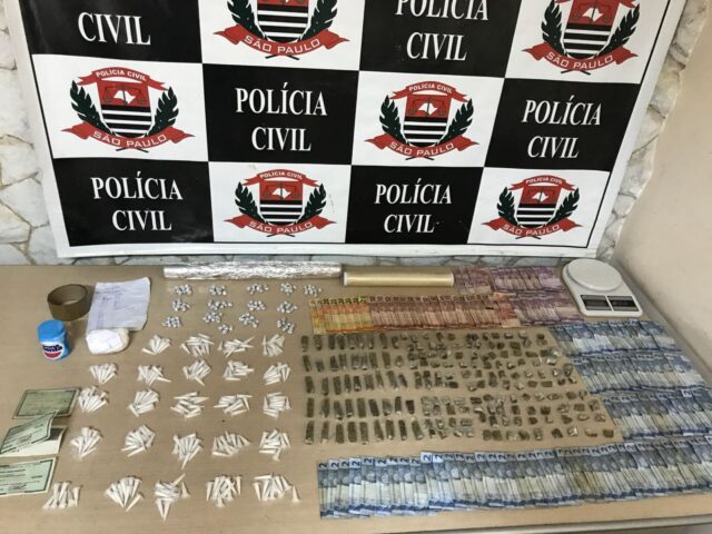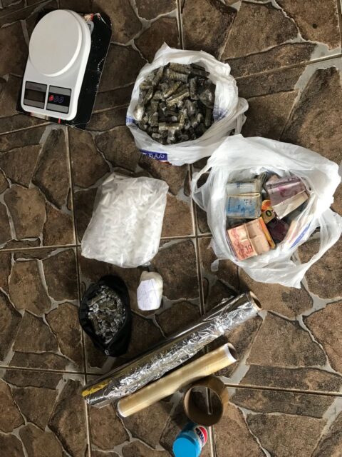 Ao todo, foram apreendidas 237 porções de cocaína, 172 porções de maconha, 135 porções de crack, 100 gramas de cocaína a granel, balança de precisão, rolo plástico e de papel alumínio para embalo, e R$ 607 em espécie.