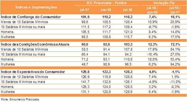De acordo com a assessoria econômica da FecomercioSP (Federação do Comércio de Bens, Serviços e Turismo do Estado de São Paulo), a alta se deve à melhora de algumas variáveis econômicas, como queda na inflação e taxa de juros. “No resultado mensal, a confiança havia caído em junho por conta da greve dos caminhoneiros, mas agora já começa a se recuperar”, explica Itacir Nozella, presidente do Sincomércio Piracicaba.