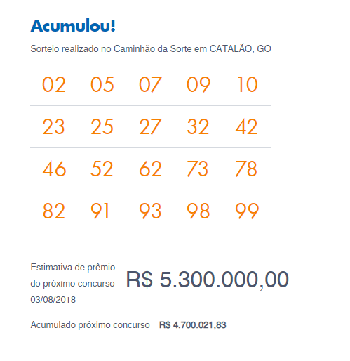 Resultado do último concurso da Lotomania, ocorrido em 27/07/2018