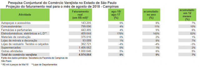 O comércio varejista na região de Campinas, que compreende Piracicaba, deve crescer 8% em agosto em comparação ao mesmo período de 2017. No mês que é comemorado o Dia dos Pais, o faturamento real do setor pode atingir R$ 4,97 bilhões, segundo estimativa da Federação do Comércio de Bens, Serviços e Turismo do Estado de São Paulo (FecomercioSP).