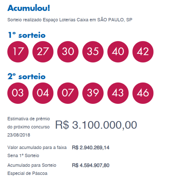 Resultado do último concurso, ocorrido em 18 de agosto de 2018. Confira: