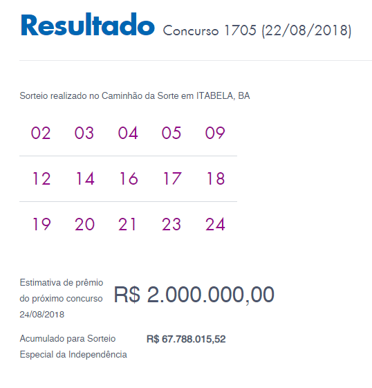 O resultado da Lotofácil 1705 saiu após o sorteio do concurso que estava agendado para a noite desta quarta-feira, 22 de agosto de 2018. O valor do prêmio é de quase R$ 2 milhões. O resultado completo você confere aqui no site do Jornal PIRANOT.