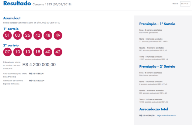 O sorteio da Dupla-Sena 1833 está agendado para a noite desta quinta-feira (30). Os jogadores que acertarem os seis números, poderão levar para a casa o prêmio de R$ 4 milhões de reais. O resultado completo você confere aqui no site do Jornal PIRANOT, por volta das 22h.