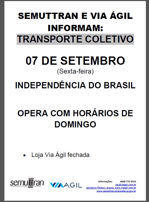 Na tarde desta quinta-feira (06), a Secretaria Municipal de Trânsito e Transporte (Semuttran), em parceria com a Via Ágil, divulgou todos os detalhes do funcionamento do transporte público em Piracicaba (SP) para este feriado da Independência.