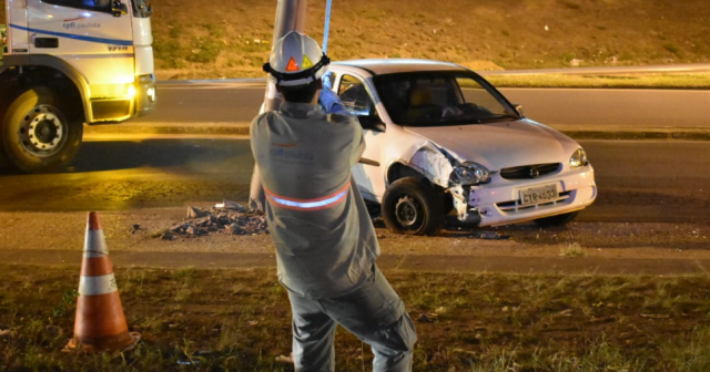 De acordo com as autoridades, um Chevrolet Corsa perdeu controle na Avenida Corcovado e colidiu contra o poste que caiu sobre ele. O motorista não esperou a chegada da polícia e fugiu.