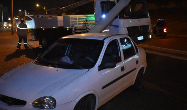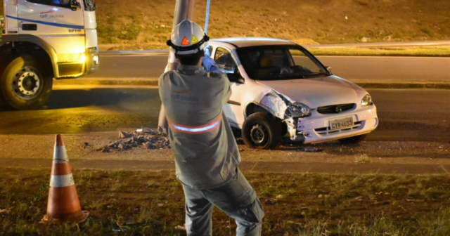 De acordo com as autoridades, um Chevrolet Corsa perdeu controle na Avenida Corcovado e colidiu contra o poste que caiu sobre ele. O motorista não esperou a chegada da polícia e fugiu.