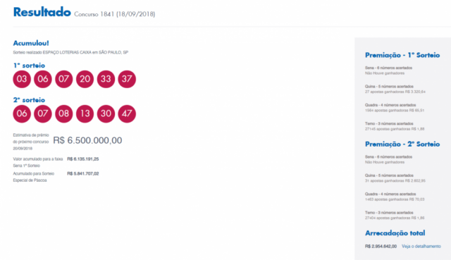 A Dupla-Sena chegou ao concurso 1841 e o sorteio está agendado para a noite desta terça-feira, 18 de setembro de 2018. O valor do prêmio está acumulado em R$ 6,1 milhões de reais. Tendo em vista que o sorteio acontece às 20h, você tem até às 19h para fazer as suas apostas. Os jogos podem ser feitos em qualquer lotérica do país ou pela internet. O resultado completo estará disponível aqui no site do Jornal PIRANOT, por volta das 22h. Não saia daí!