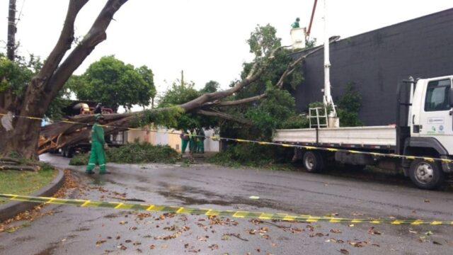 Por conta da forte chuva que atingiu Piracicaba (SP) na madrugada desta quinta-feira (20), uma árvore se partiu e caiu sobre a fachada de um restaurante no Santa Inês, zona leste do município.