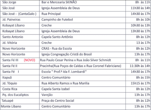 Confira abaixo a tabela de Postos de Vacinação do 2º sábado da campanha (22/09)