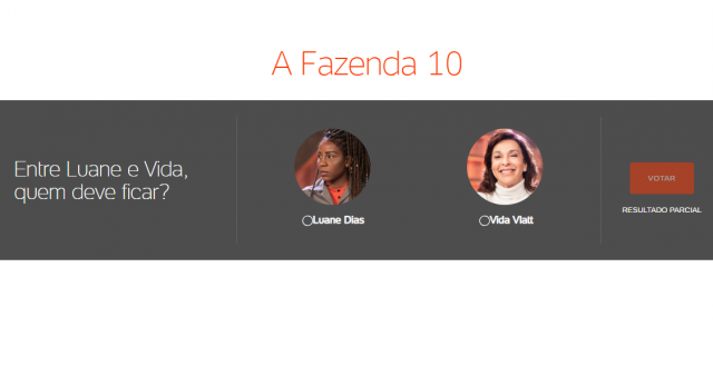 De acordo com o UOL, site tradicional por fazer pesquisas de eliminação de reality-shows, a Enquete A Fazenda 10 aponta que Luane deve ser a eliminada na primeira roça. Isso porque, às 06h10 desta quarta, 56% dos votos eram para que Vida ficasse no programa.