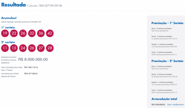 Resultado do último concurso, ocorrido em 25 de setembro de 2018. Confira: