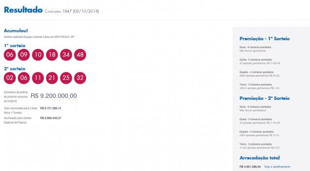 O sorteio do concurso 1847 da Dupla-Sena foi agendado para a noite desta terça-feira, 02 de outubro de 2018. Confira na imagem acima.
