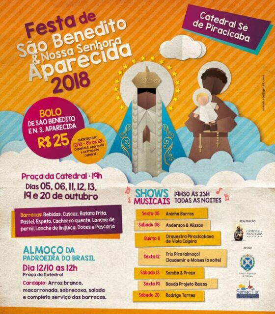 A Catedral Santo Antônio de Piracicaba realiza nos dias 05, 06, 11, 12, 13, 19 e 20 de outubro a Festa São Benedito e Nossa Senhora Aparecida. A quermesse acontece a partir das 19h na Praça da Catedral, no Centro da cidade.